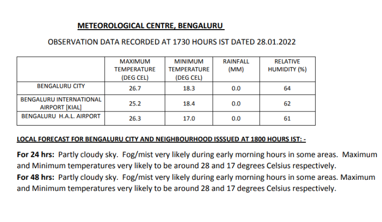 The Regional Meteorological Centre, Bengaluru on Saturday predicted partly cloudy sky with fog and mist during early morning hours in some areas of the city. The maximum temperature is likely to be around 28 degrees Celsius and the minimum temperature will be around 17 degrees Celsius.