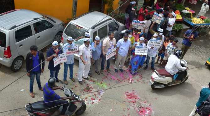Members of the Aam Aadmi Party perform symbolic worship of potholes to draw the attention of civic officials to the poor condition of roads in the Malleswaram area in Bengaluru, Saturday, Jan. 29, 2022. (PTI Photo)