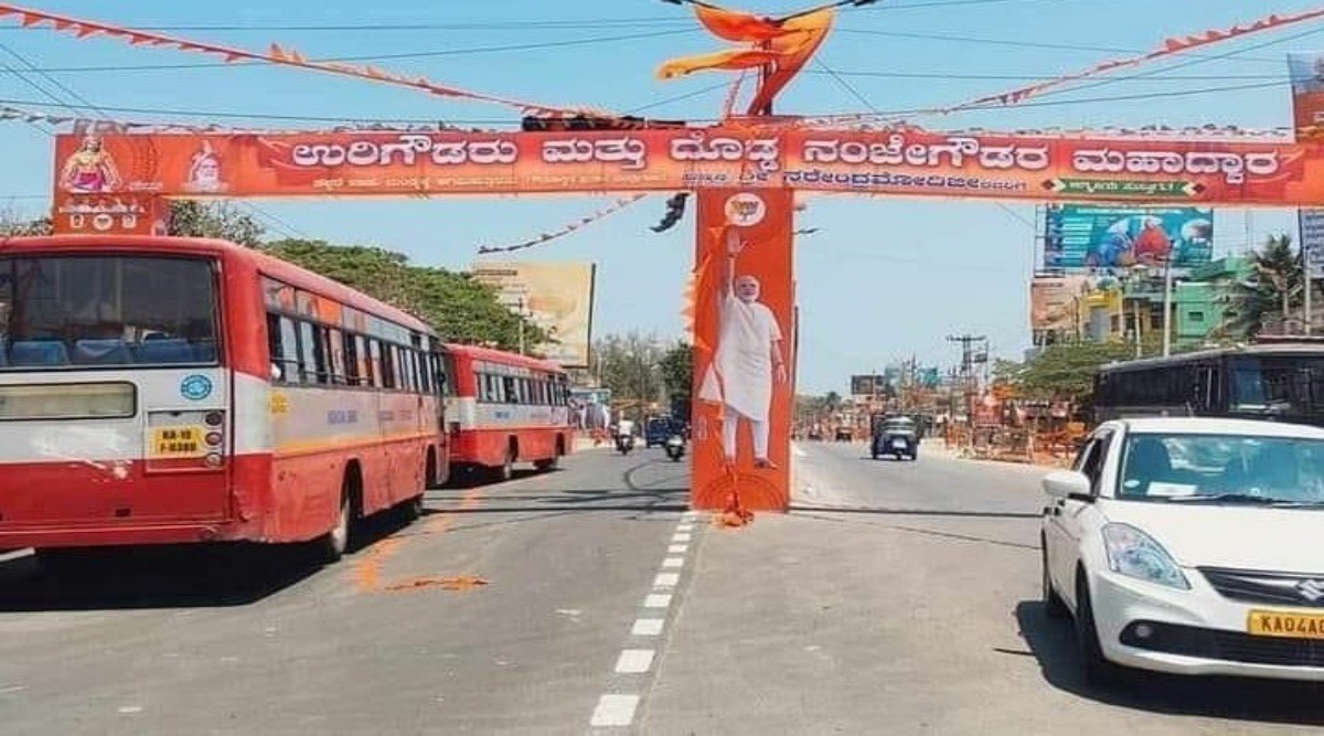 The arch was put up ahead of Prime Minister Narendra Modi’s visit to Mandya where he is unveiling several development projects, including the Mysuru-Bengaluru expressway. (Express Photo)