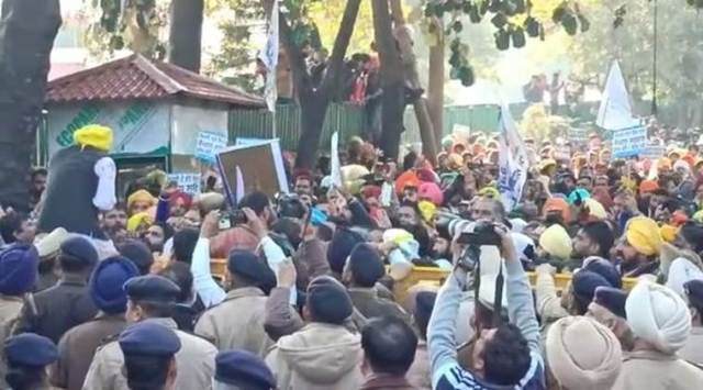 AAP workers protest outside the residence of Punjab Chief Minister Amarinder Singh on Friday. (Express photo)