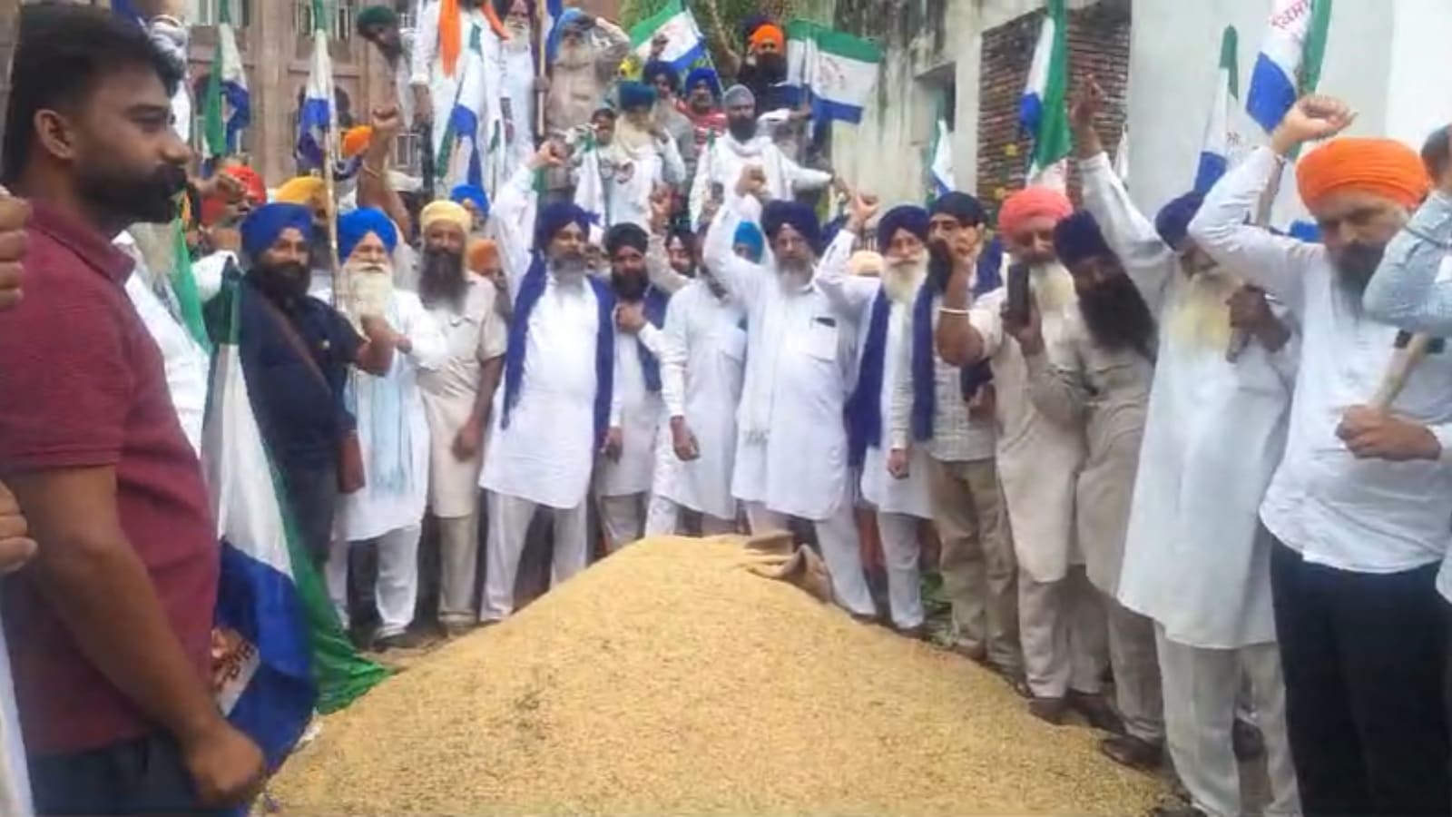 Members of the Kisan Mazdoor Sangharsh Committee dumping their Basmati crop on the roads on Saturday. (Express Photo)