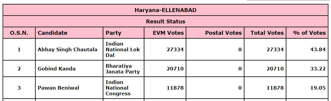 INLD's Abhay Chautala has won the race for Haryana's Ellenabad Assembly constituency with a lead of over 6,500 votes over ruling BJP's Gobind Kanda and and Congress’s Pawan Beniwal. After the 16 rounds of counting, Chautala ended up with 65,897 votes, Kanda with 59,189 votes and Pawan Beniwal with 20,857 votes.