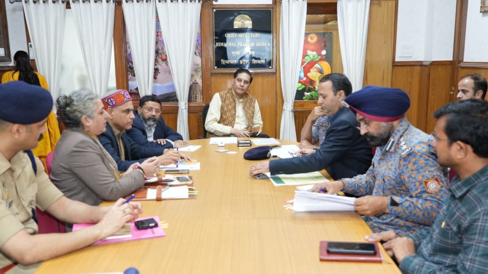 Chief Secretary Prabodh Saxena chairs a high-level meeting in Shimla on Thursday. (Express Photo)