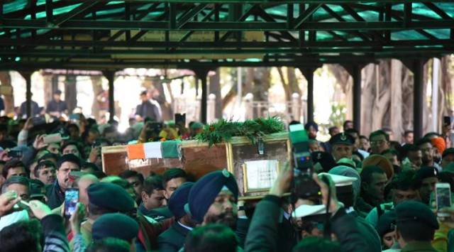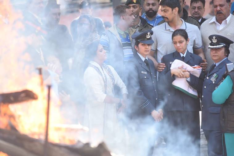 THE MORTAL remains of Squadron Leader Sidharth Vashisht were cremated with full military honours in Chandigarh on Friday. The pyre was lit by the father of officer, Jagdish Kasal. A large number of people were present to bid adieu to the brave officer. Senior civil and defence officers and political leaders paid homage to the Squadron Leader by placing wreaths on the body.