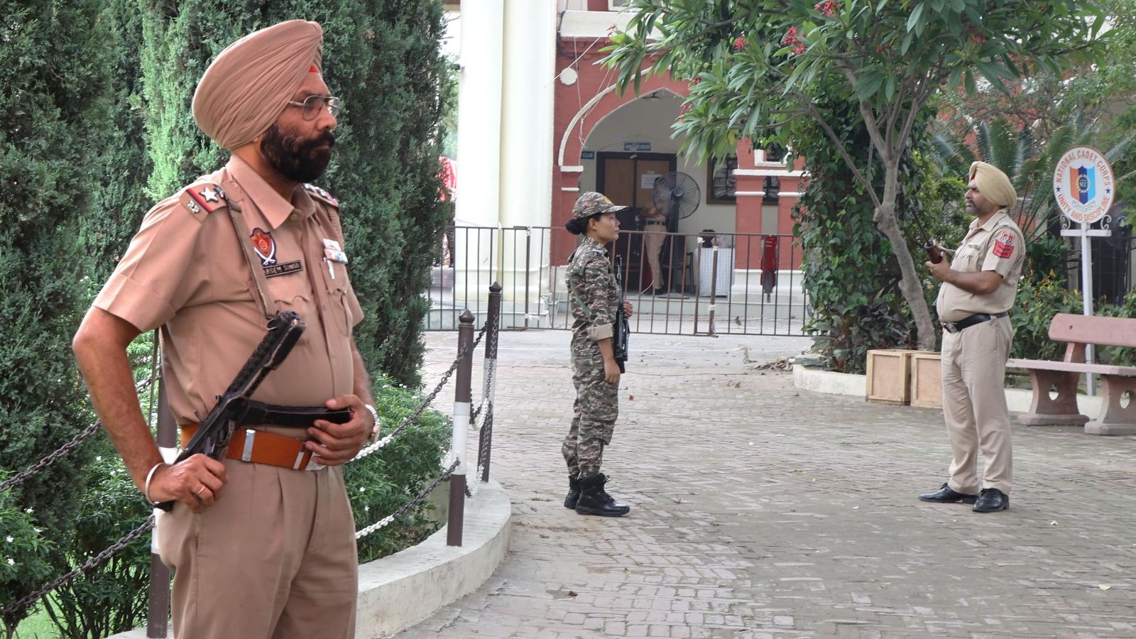 Personnel guard the EVM strong room at Khalsa College for Women, Friday. ((Express Photo by Gurmeet Singh)