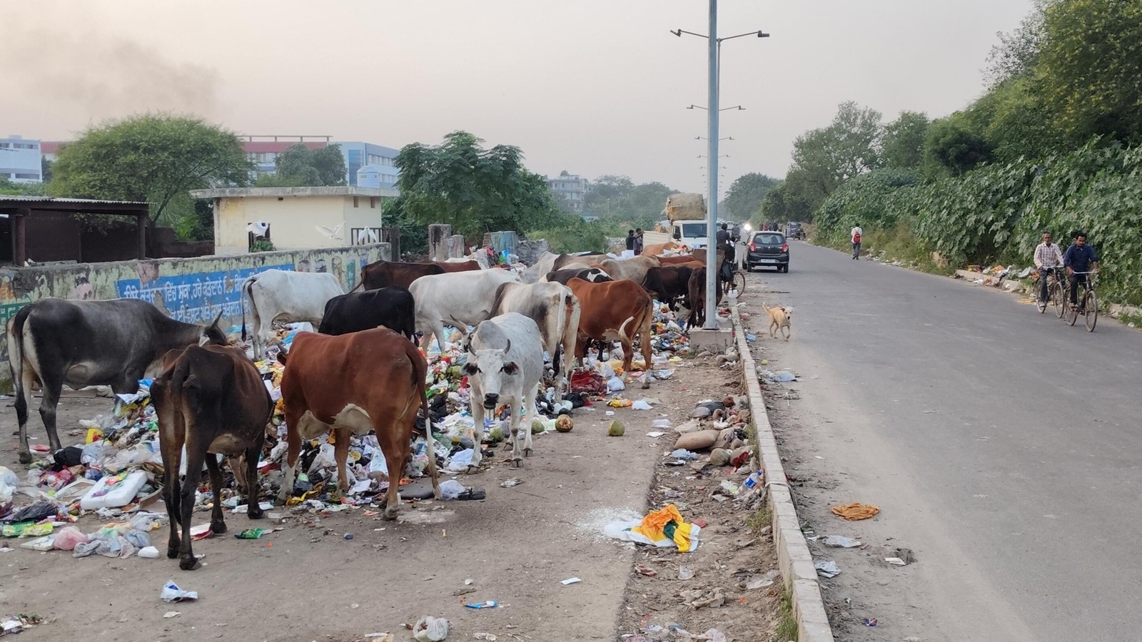 Garbage strewn on the road near Gurdwara Dashmesh Darbar at Phase 10 in Mohali (Express/Jasbir Malhi)