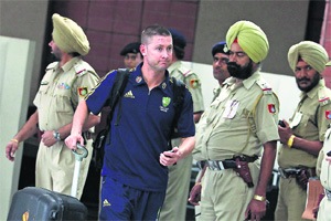 An overcast sky greeted the Australian team as they reached Chandigarh this afternoon. After the attack on two Taiwanese nationals in New Delhi on Sunday,the team reached their destination amid heavy security for the first Test for the Border Gavaskar Trophy starting in Mohali from October 1. Before that,the Australian team will take on Board President XI side in a three-day match starting from September 25 at the Sector 16 cricket stadium.