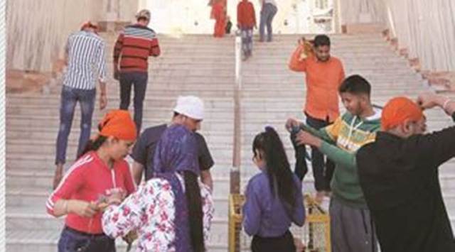 Early this week, the SGPC had directed devotees at the Golden Temple to maintain a distance of 3 metres from each other. They were also told to take batches of 10-15 devotees to the sanctum sanctorum to avoid crowding and sewadars were stationed outside the temple with hand sanitisers. However, there were no such arrangements in place at Nada Sahib. Devotees were taking scarves from a basket as usual and sitting in close proximity.