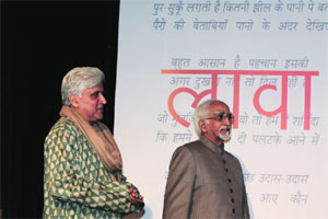 He is one Bollywoods best-known dialogue writers and lyricists. Javed Akhtar,the writer of Sholays (1975) unforgettable lines Kitne aadmi thay,which cast an unrelenting hold over the sly humour of filmy villains,to the heartbreaking song Sandese aate hain,from the 1997 film Border that won a National Award,and the recent poems for his daughters last production Zindagi Na Milegi Dobara,was in Delhi to launch his second book. Fourteen years after Tarkash,the 67-year-old writer-poet-lyricist,Akhtar Jadu to wife Shabana Azmi and Javed saab to the industry launched Lava,his second collection of poetry (Rajkamal Prakashan,Rs 250) at the India Habitat Centre in Delhi on Sunday. The book was released by Hamid Ansari,the Vice President of India. I have been writing this book for a long time but didnt publish it,thinking that it lacked something. It has given me the liberty to express myself which doesnt happen when writing for Bollywood films and songs. There,I have to work according to the situation and the demands of the script but this book is my personal space, said Akhtar. The collection of poems dwells around subjects like love for the neighbour (Humsaya),and includes dedications to his son (Mela),daughter (Doraha ) and wife (Shabana). Several nazms and ghazals ,too dot the pages. Akhtar read Mela,Doraha and a poem Ped se lipti bel while a rivetted audience listened. Also present were his wife and actor Azmi,his children both Bollywood names in their own right Farhan Akhtar and Zoya Akhtar. His reading met a passionate applause,even the occasional irshaad by Ansari. The Vice President could have been talking on behalf of most in the audience when he remarked,Im not a poet,nor a writer,but I have come here for the love of the craft.