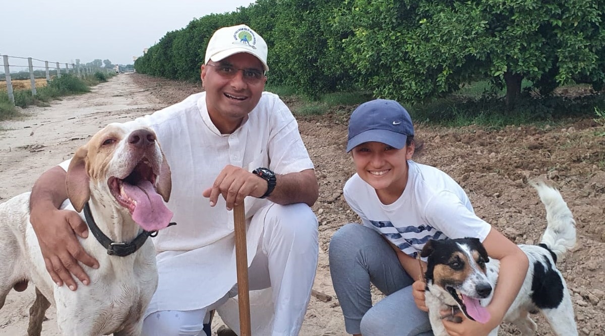 Jakhar with daughter Meera and his pet dogs. (Express Photo)