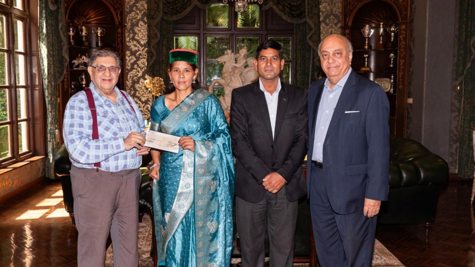 Dr Cyrus Poonawalla, chairman of Serum Institute of India, hands over a cheque for Rs 5 lakh to health worker Kamla Devi as her husband Karam Singh and Jaswinder Narang, CEO, Villoo Poonawalla Foundation, look on, in Pune. (Express photo)