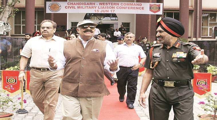 UT Administrator V P Singh Badnore and Lt General Surinder Singh at Chandimandir on Thursday. Express photo
