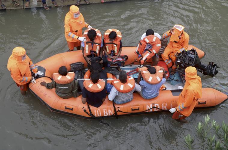 NDRF personnel carry out a rescue operation to move locals to safer places after the landfall of Cyclone Nivar, at Mudichur in Chennai, Thursday, Nov. 26, 2020. (PTI Photo)