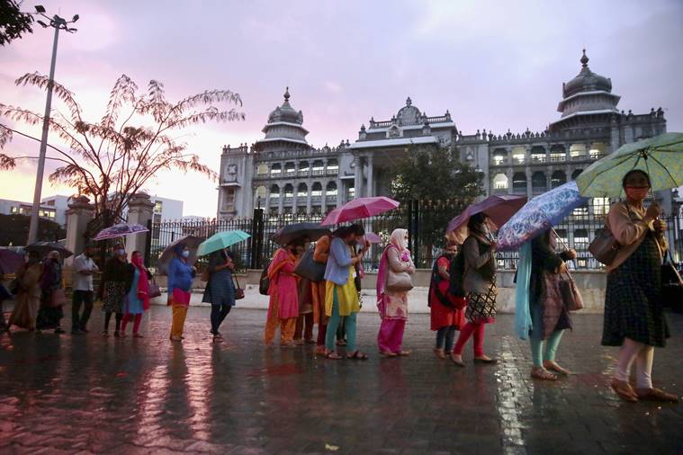 People stand in a queue to board the metro train during rain after the landfall of Cyclone Nivar, in Bengaluru, Thursday, Nov. 26, 2020. (PTI Photo)