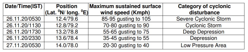 The depression lay centered over south coastal Andhra Pradesh near latitude 14°N and longitude 79.5°E, about 35 km north of Tirupati and 70 km south-southwest of Nellore at 11.30 pm on November 26. The depression is expected to move northwards and weaken into a low pressure area over the next 12 hours.