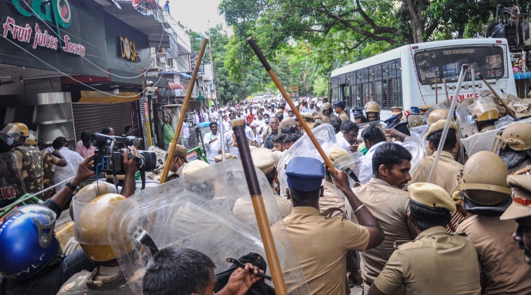 Chennai: Security personnel attempt to maintain law and order after two groups of suspected AIADMK workers clashed outside the party headquarters, in Chennai, Monday, July 11, 2022. (PTI Photo)AIADMK interim General Secretary Edappadi K Palaniswami (EPS) and ousted party leader O Panneerselvam on Tuesday moved the Madras High Court against the sealing of the party headquarters by the Tamil Nadu government following violence there on July 11.