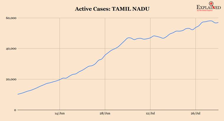As of Sunday, the number of active COVID-19 cases in Tamil Nadu is 56,998. Till date, 1,56,140 males, 1,01,446 females and 27 transgenders have tested positive for the virus in the state.
