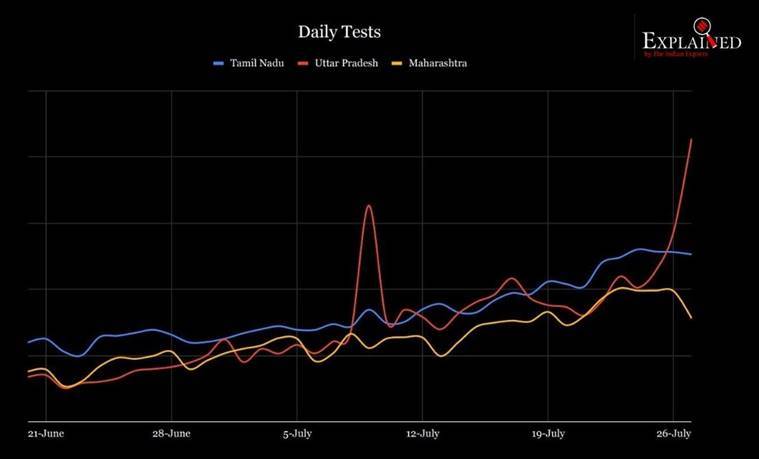 Tamil Nadu leads the testing figures in India by a comfortable margin, having tested more than 24.14 lakh samples till now. UP on Monday become the first state to test more than one lakh samples a day for the infection. Till now, UP has tested 19.41 lakh samples, while Maharashtra has tested 19.25 lakh.