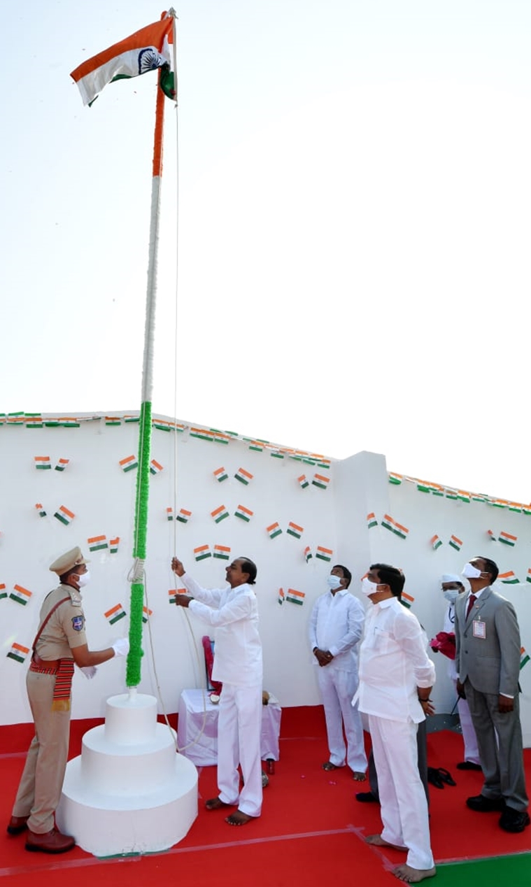 Telangana Chief Minister K Chandrashekar Rao unfurled the national flag and offered floral tributes to Mahatma Gandhi at his camp office, Pragathi Bhavan today.