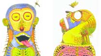 At the Triveni Gallery, where his works are on display in an exhibition called “Head Tale,” the walls have come alive with the colour that his canvases have brought about. Bhowmick’s spirited ink lines flow out on to paper, giving outlines to fanciful and bizarre heads. In Well Masked Warrior, eerie worm-like creatures are shown wriggling out of the head. Also seen is the zig-zag trail left behind by a dragonfly, which has escaped from the head’s dark-coloured mouth, and is now meandering near his head.
