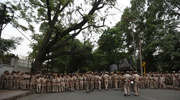 In a show of strength, over a thousand Aam Aadmi Party workers marched from Chief Minister Arvind Kejriwal’s residence to Raj Niwas, the L-G’s house, Wednesday, demanding action against IAS officials who were “not cooperating” with the elected government. Kejriwal and three of his ministers have been camping inside the visitor’s room at Raj Niwas since Monday.