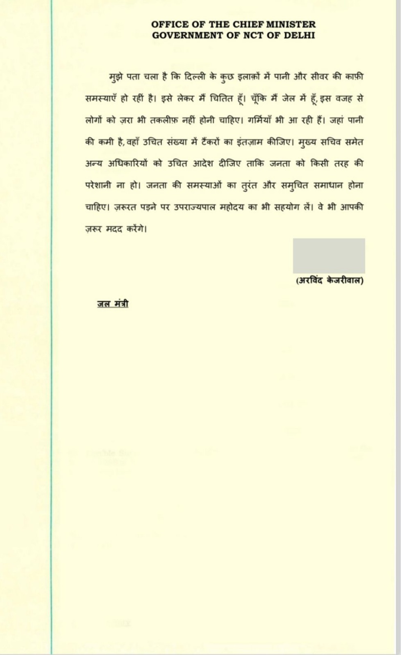 “I have come to know that few areas of Delhi have been facing problems related to water and sewerage, that is why I am worried because I am in jail and because of that people of Delhi should not face any problem,” Kejriwal wrote.
