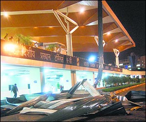 A Central Industrial Security Force (CISF) officer said: There is water in lifts and air-conditioners. Security equipment is not working either. Passengers said the section of the roof that collapsed also brought down with it a light post.