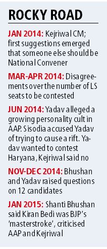 Singh also announced that a National Executive meeting would be held on March 4, where the events of the past two days would be discussed. Sources said both Yadav and Bhushan would be excluded from the Political Affairs Committee, the party’s highest political decision-making body.