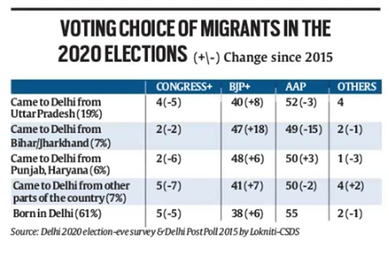 At roughly 40% of Delhi’s electorate, migrants (those who have come to the city from other states) have often been touted as an important voting bloc that may prove decisive in any poll outcome. While the election this time was far from close, Lokniti’s poll-eve survey data indicates that migrants, especially from Bihar-Jharkhand (around 7% of Delhi’s electorate) — also known as Purvanchalis — may have played a significant role in boosting BJP’s vote share, thus increasing its seat tally a bit.