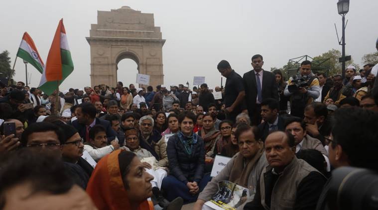 Congress leader Priyanka Gandhi Vadra Monday led a sit-in protest at India Gate against police action on students in universities.