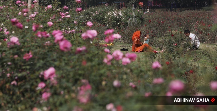 Children at the Rose Garden in Noida on Monday. The minimum temperature during the day is likely to settle at around 7 degrees Celsius in Delhi, according to the India Meteorological Department (IMD) forecast. (Express Photo by Abhinav Saha)