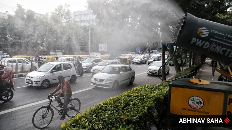 An anti-smog gun deployed at ITO to contain pollution in New Delhi on Monday. The air quality, meanwhile, could remain in the ‘poor’ or lower end of the ‘very poor’ category on Monday, going by the Air Quality Early Warning System for Delhi. The AQI is likely to remain in the ‘very poor’ category on Tuesday and Wednesday as well. (Express Photo by Abhinav Saha)