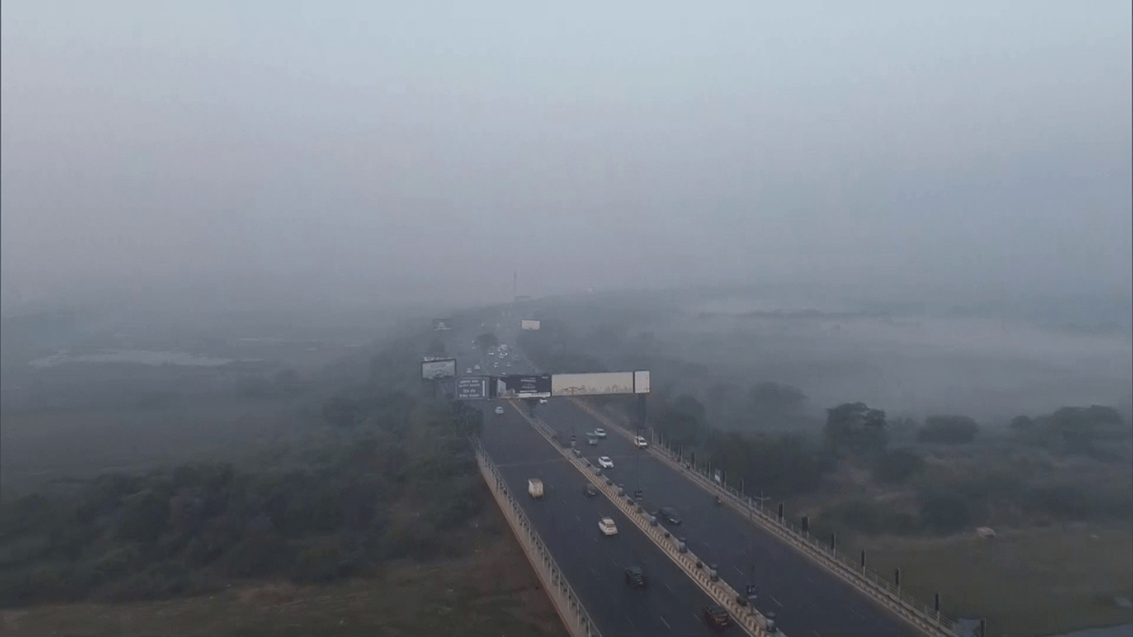 Delhi AQI November 25: A drone visual on Monday shows Delhi-Noida-Delhi (DND) Flyway and surrounding areas covered in a thick layer of smog as the Air Quality Index (AQI) deteriorates (Photo: ANI).