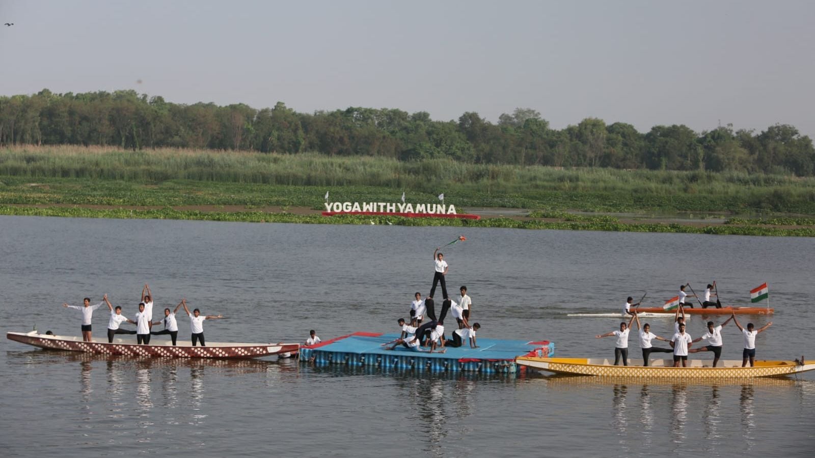 As part of ‘Yoga With Yamuna,’ children performed yoga in the middle of the river, while others kayaked bearing Indian flags. The event was among the 11 programmes being conducted across Delhi on the occasion.