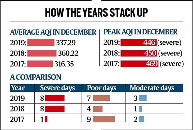 Data from the Central Pollution Control Board (CPCB), analysed by The Indian Express, shows there were also higher number of ‘moderate’ and ‘poor’ air quality days in December 2019 compared to the December before that.