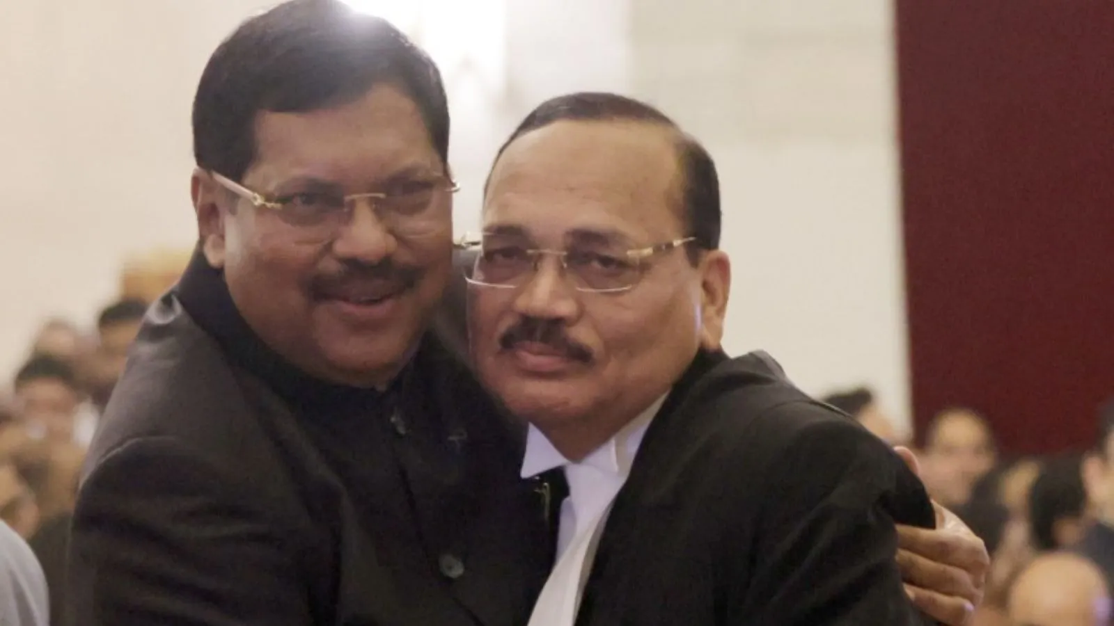 Former CJI BR Gavai and newly sworn-in Chief Justice of India Surya Kant share a warm moment with a hug.