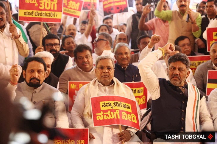 Chief Minister Siddaramaiah, Deputy Chief Minister DK Shivakumar and several other Congress ministers, MLAs and MPs from Karnataka protested at Jantar Mantar in New Delhi on Wednesday against the “injustice” done to the state in the devolution of taxes and grants-in-aid over the past few years.