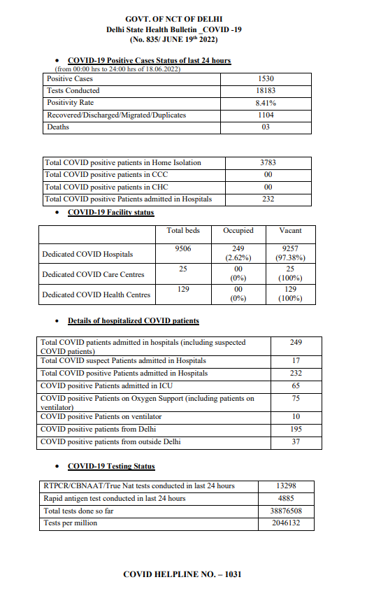 Delhi reported1,530 fresh Covid-19 infections in the last 24 hours along with 3 new deaths. Active cases stand at 5,542 while positivity rate stands at 8.41 per cent.