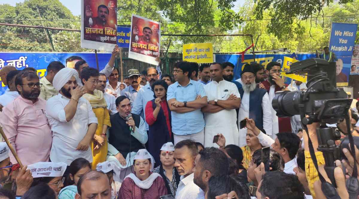 Aam Aadmi Party (AAP) workers and leaders gathered outside the party headquarters in New Delhi Thursday, protesting MP Sanjay Singh’s arrest by the Enforcement Directorate (ED) on Wednesday in connection with the Delhi excise policy case.