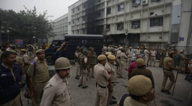 Police outside the Tiz Hazari court. Express Photo by Praveen Khanna