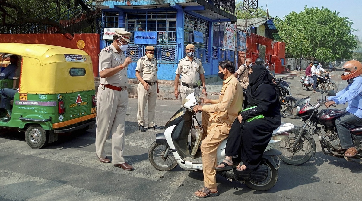 Delhi police personnel check e-passes of commuters on Saturday while enforcing the weekend curfew. (PTI)