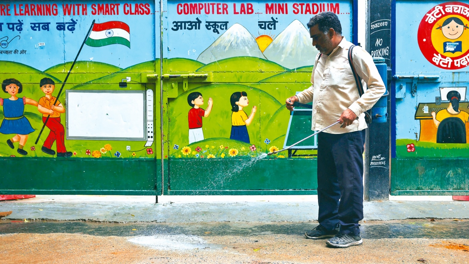 A worker sprays medicine outside a school to control mosquito breeding. Archive