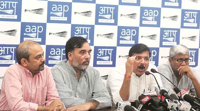AAP leaders Dilip Pandey, Gopal Rai, Sanjay Singh and Ashutosh in New Delhi, Saturday. Express Photo Amit Mehra