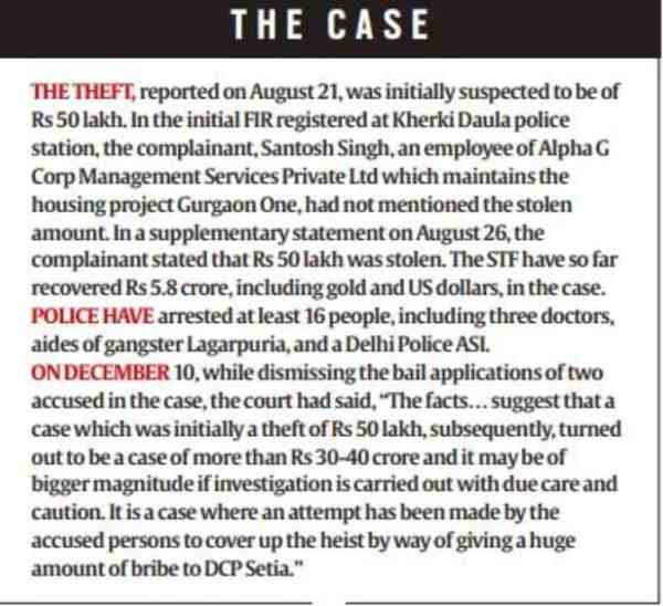 Hinting at the involvement of more police officers, the court said, “Circumstances of the case suggest that in his supervisory capacity, he (Setia) might have exerted his influence upon his subordinates to twist the investigation in a way to make it appear a case of theft of Rs 50 lakhs. Meaning thereby that he might have involved the junior level officers of the rank of ACP, SHO, etc to twist the investigation in a way to confine it to the theft of Rs 50 lakhs.”