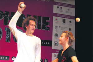 Belgian juggler Toon Schvermans,36,specializes in an unusual ball game keeping four balls in the air. His piece de resistance,however,is called Bal-a-Balles-Musette in which he bounces rubber balls off the ground into his hand while his partner France Perpete,46,carefully times her steps to skip and dance between the bouncing balls. Bal-a-Balles-Musette is one of the duos most popular acts,and has been performed in 500 shows across Europe,Japan and Korea. On Friday,the duo will perform this act as part of the annual Francophonie Week at the Alliance Francaise,their first time in India.