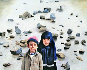 One painting shows a young boy and his burqa-clad sister staring pensively into a distance. Behind them,menacing looking stones litter the canvas. This painting by artist Suman Gupta,titled Stone Pelters-I,is on display at Gallerie Navya as part of an exhibition titled Return of the Hangul. The 25 paintings on display reveal the artists nostalgia for the age of innocence and peace that once gave Kashmir its title of Paradise on Earth.