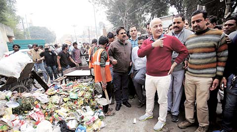 Deputy Chief Minister Manish Sisodia inspects a garbage dump in Patparganj. Praveen Khanna