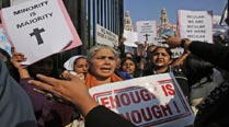 Christians hold placards protesting against recent attacks on churches in New Delhi as they assemble outside the Sacred Heart Church in New Delhi (AP photo)