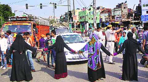 Women block a road near Turkman Gate. (Source: Praveen Khanna)