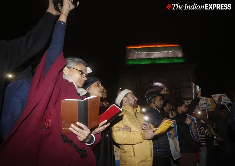 While campuses saw demonstrations during the day, the action shifted to India Gate in the afternoon, with groups of people gathering to read out the Preamble to the Constitution. The air resonated with the slogans of “Delhi Police down down”.